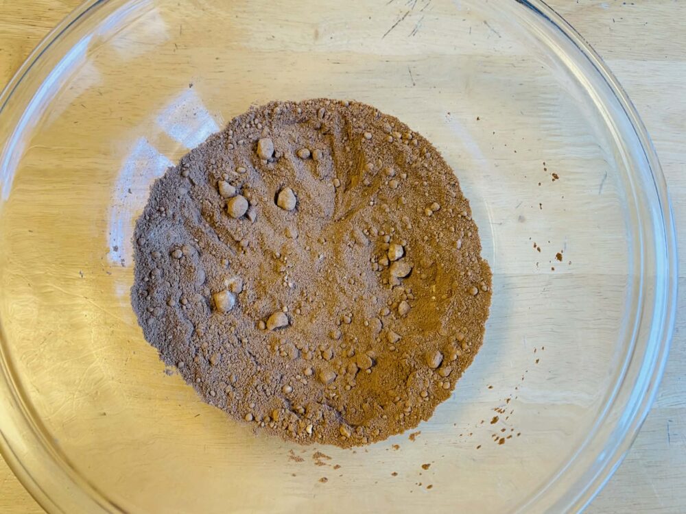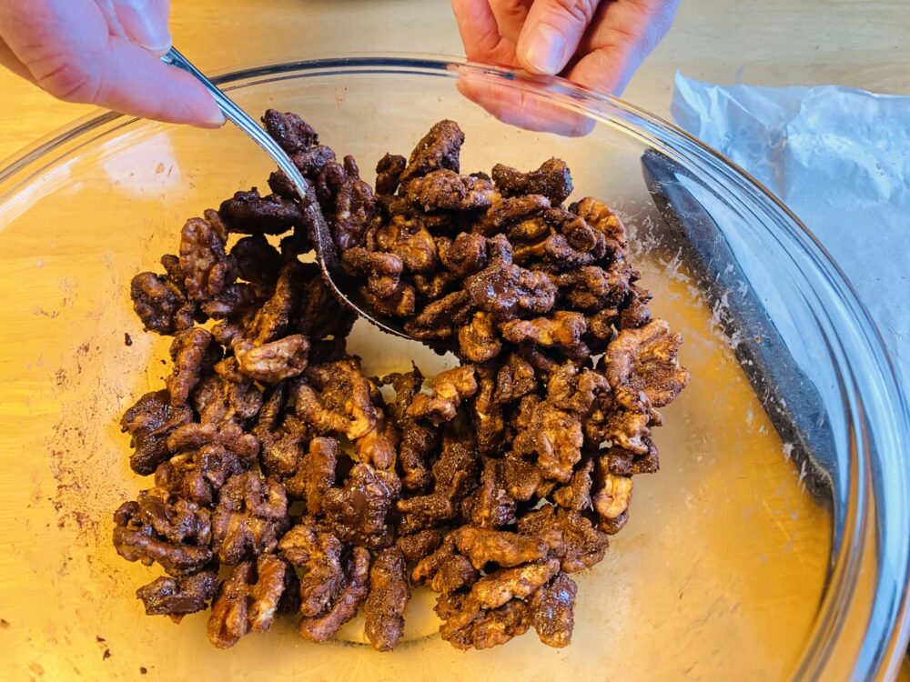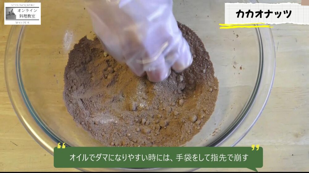 5 スプーンでをナッツにコーティングする。その際に、ボウル底にカカオが残らないようにコーティングするのがポイント!