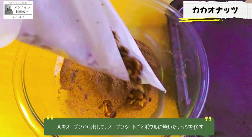 4 をオーブンから取り出して、オーブンシートごとボウルに焼いたナッツを移す。